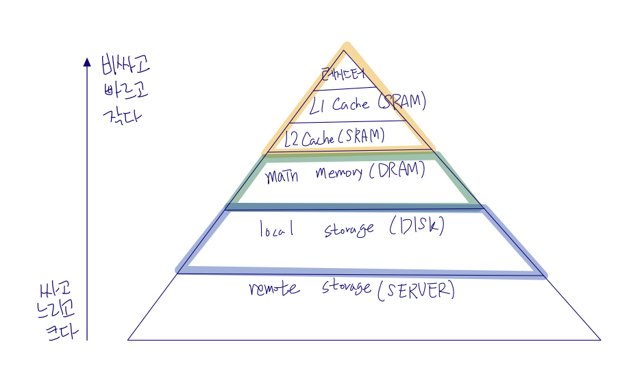 지금까지 알아본 모든 메모리 관리 방법들은 모두 메모리의 크기보다 작은 프로세스의 경우만 알아봤었습니다. 그렇다면 만약 메모리의 크기보다 큰 프로세스를 실행하려면 어떻게 해야 할까요? 이를 위해서는 컴퓨터 구조에서 중요하게 다루는 memory hierarchy(메모리 계층 구조)에 추가적인 계층이 필요합니다. Paging 기법에서 모든 page는 메모리에 존재한다고 가정했었는데 더 큰 주소 공간을 가진 프로세스를 위해서 OS는 현재 사용 빈도가 낮은 page들을 메모리에서 해제하고 다른 곳에 저장해둘 공간이 필요합니다. 이 공간이 바로 Disk입니다. 즉 이를 추가한 메모리 계층 구조를 그려보면 아래와 같습니다.