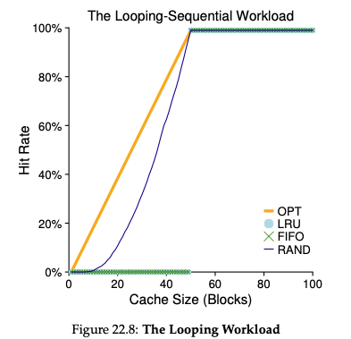 마지막으로 살펴볼 workload는 반복적으로 참조하는 것으로 0~49 page까지 순서대로 50개의 page를 참조하는 것을 반복하는 상황에서의 workload입니다. 당연하게도 캐시의 크기가 50을 넘어가게 되면 모든 정책에서 hit가 100%로 나타납니다. 하지만 캐시 크기가 50 미만일 때는 LRU, FIFO가 모두 최악의 경우인 hit율 0%를 보입니다. 이에 비해 Random은 어느 정도 성능이 나오는 것을 볼 수 있는데, 이것이 Random 방법의 장점으로 예외가 없다는 점입니다.