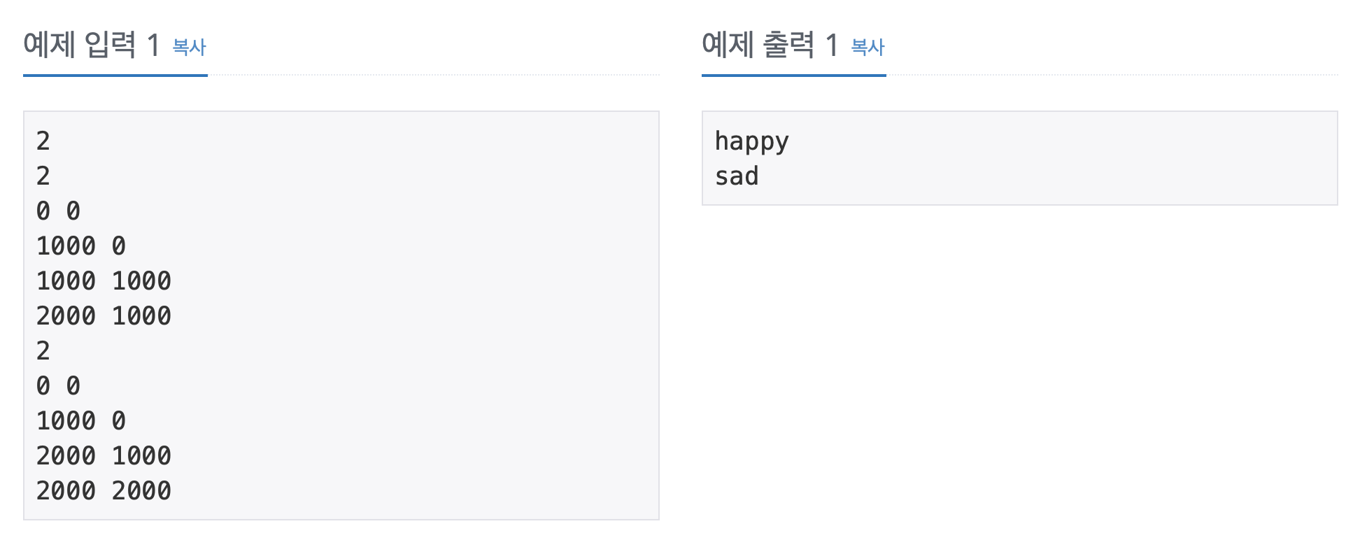 각 테스트 케이스에 대해서 상근이와 친구들이 행복하게 페스티벌에 갈 수 있으면 "happy", 중간에 맥주가 바닥나면 "sad"를 출력한다.
