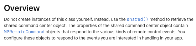 공식문서에 보시면, MPRemoteCommandCenter도 싱글 톤 객체라서 shared()라는 공유 객체에 작업을 해주시면 된다고 합니다. 그리고 중요한 건데 이러한 명령어를 받는 것을 시작하는 걸 앱에게 알려줘야 해요.