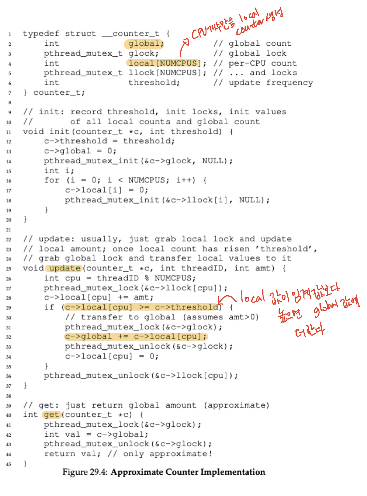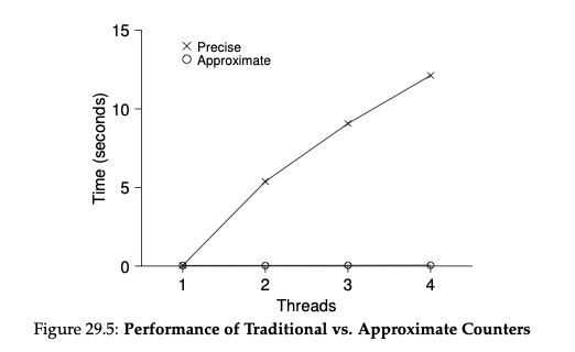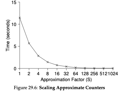lock을 사용할 때 스레드가 증가하면 성능이 나빠지는 문제를 해결하기 위해 approximate counter(근사 카운터)라는 아이디어가 도입되었습니다. 근사 카운터는 CPU 코어 당 하나의 local 카운터가 있고 전체적으로 공유하는 하나의 global 카운터를 갖도록 하는 아이디어입니다. 각 코어마다 존재하는 하나의 local 카운터에 값을 증가시키다가 일정 값에 가까워지면 이를 global 카운터에 더하는 아이디어입니다.