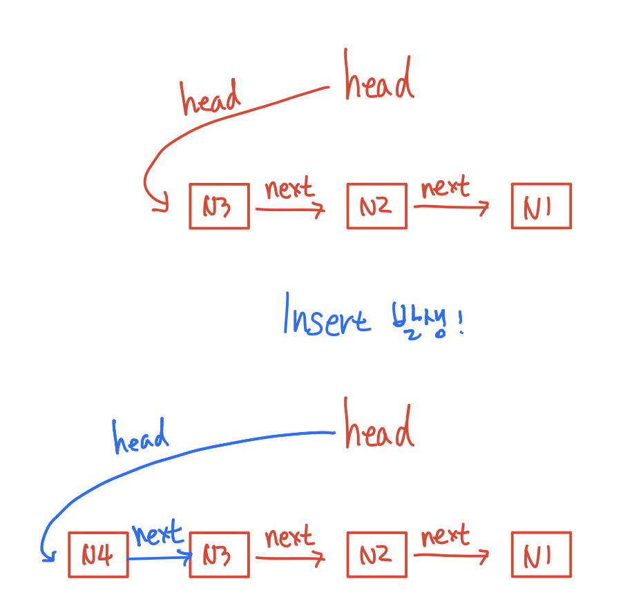 위와 같이 삽입 함수가 호출되면 head 포인터를 새로 삽입되는 노드를 가리키도록 만들어줘야 하고 삽입되는 노드의 next 포인터를 원래 존재하던 노드 중 마지막 노드를 가리키게 해줘야 합니다.