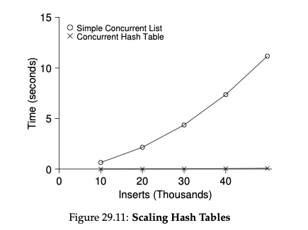 이렇게 해시 테이블을 thread safety 하게 구현한 뒤 여러 스레드가 동시에 업데이트를 진행하는 작업을 수행하면 위와 같이 한 개의 lock을 사용하는 해시 테이블보다 성능이 훨씬 좋아지는 것을 볼 수 있습니다.