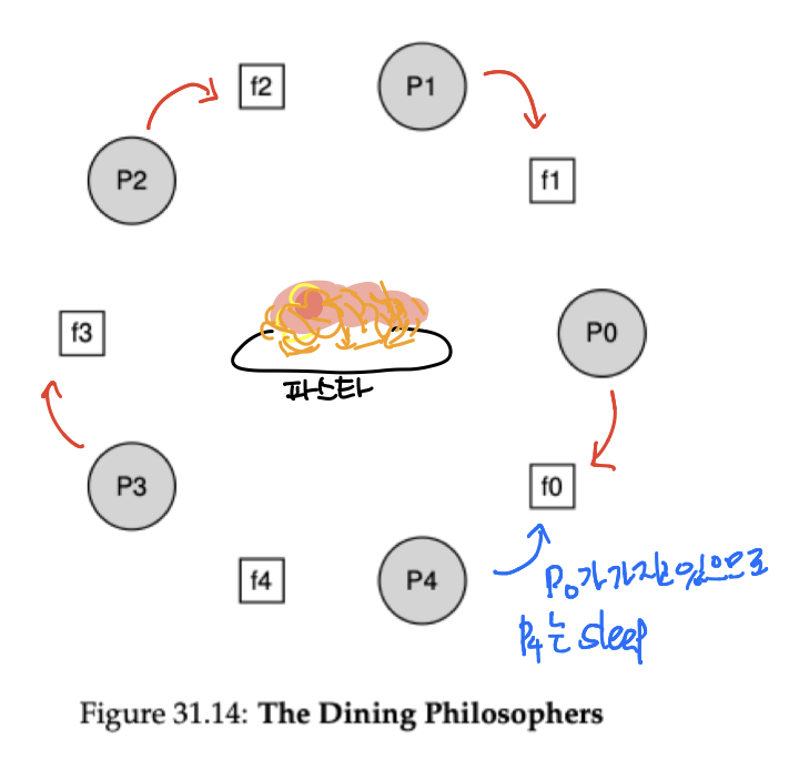 위와 같이 p4는 sleep 상태로 전환되고 p3이 f4를 얻어서 식사를 하고 포크를 내려놓으면 p2도 식사를 하고... 계속해서 철학자들은 식사를 할 수 있게 됩니다. 이렇게 간단하게 해결한 사람이 다익스트라라고 합니다.