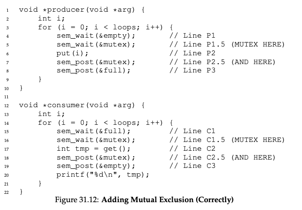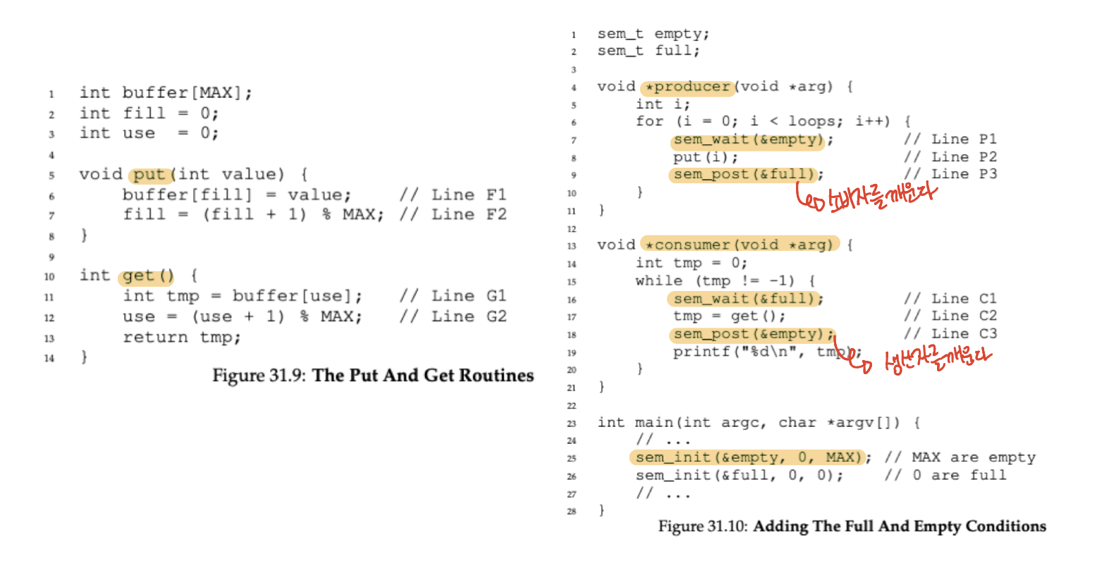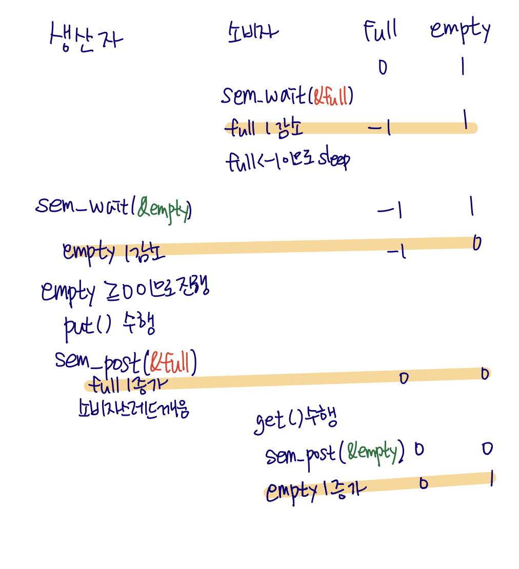 위와 같은 과정으로 수행되게 될 텐데요, 먼저 소비자 스레드가 실행된다고 보겠습니다. sem_wait(&full)을 수행하게 되고 full 값을 1 감소시켰더니 0보다 작아져서 sleep 상태가 됩니다. 그런 뒤 생산자 스레드가 실행되고 sem_wait(&empty)를 수행하고 초기값이 1이었기 때문에 감소를 하더라도 0보다 커서 그냥 진행합니다. put()을 수행하게 되고 sem_post(&full)을 수행합니다. 따라서 full 값이 다시 0이 되고 소비자 스레드도 깨우게 됩니다. 소비자 스레드는 아까 잠들기 전 시점부터 다시 수행하므로 get()을 수행하고 sem_post(&empty)를 수행하여 empty값을 1 증가시킵니다. 이와 같은 과정이 계속 반복되게 됩니다.