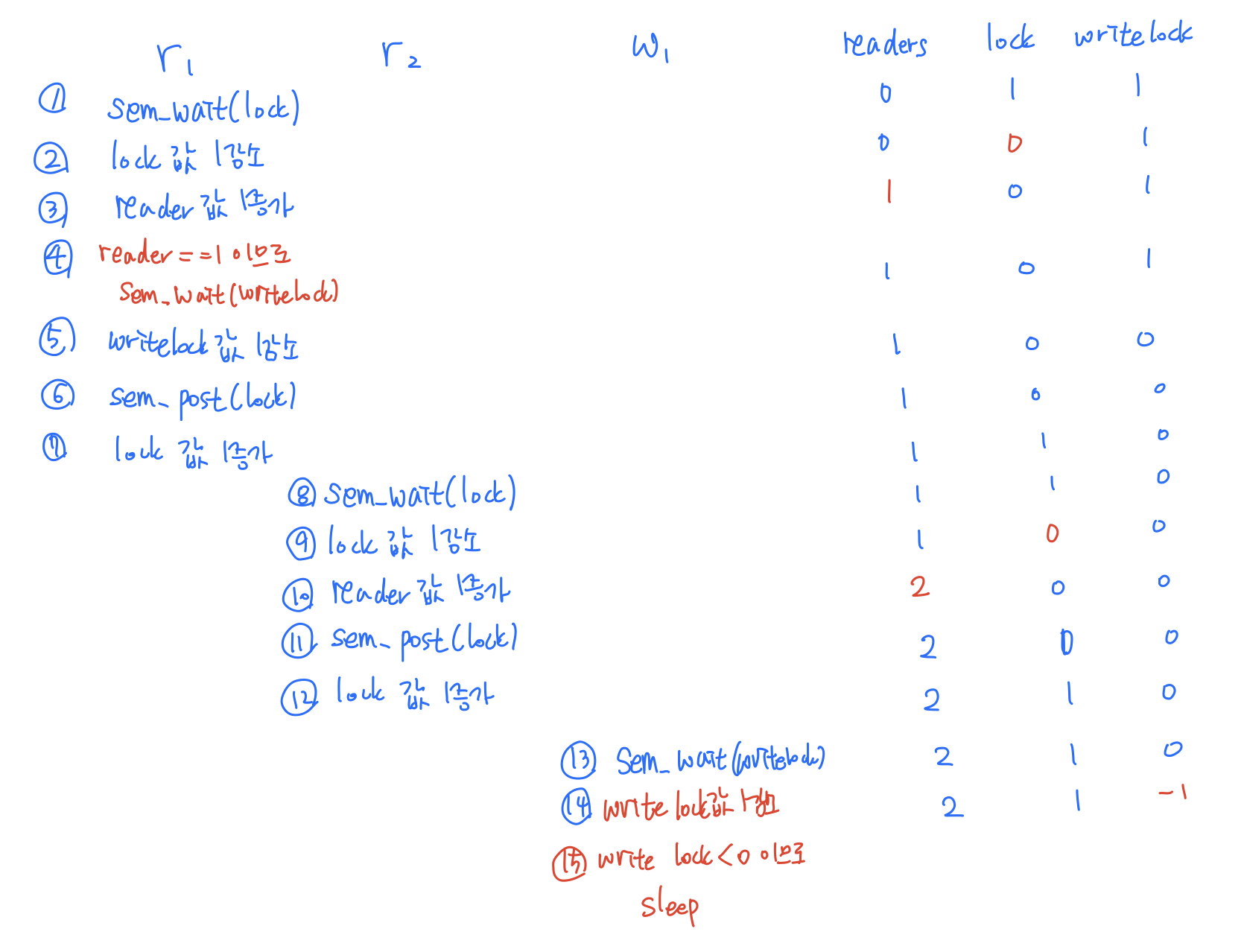 음 좀 삐뚤삐뚤하지만.. 이해 바랍니다. ㅠ.ㅠ 위와 같이 진행되게 되는데 결과적으로 reader가 하나라도 존재하면 writer는 sleep 상태로 존재해야 합니다. 언젠가 readers == 0이 만족되어 sem_post(writerlock)을 해줘야 비로소 sleep 상태에서 깨어나게 되죠. 따라서 reader, writer 문제에서 위의 코드는 공평하지는 않습니다. writer가 오랫동안 sleep 상태에 빠지게 되는 상황이 자주 발생하기 때문이죠.