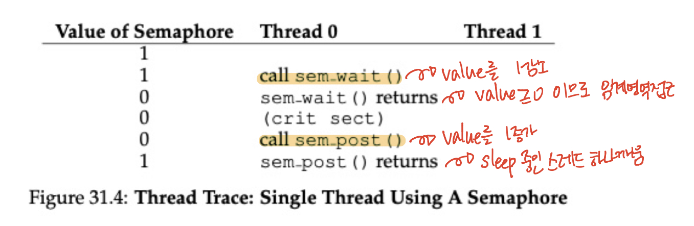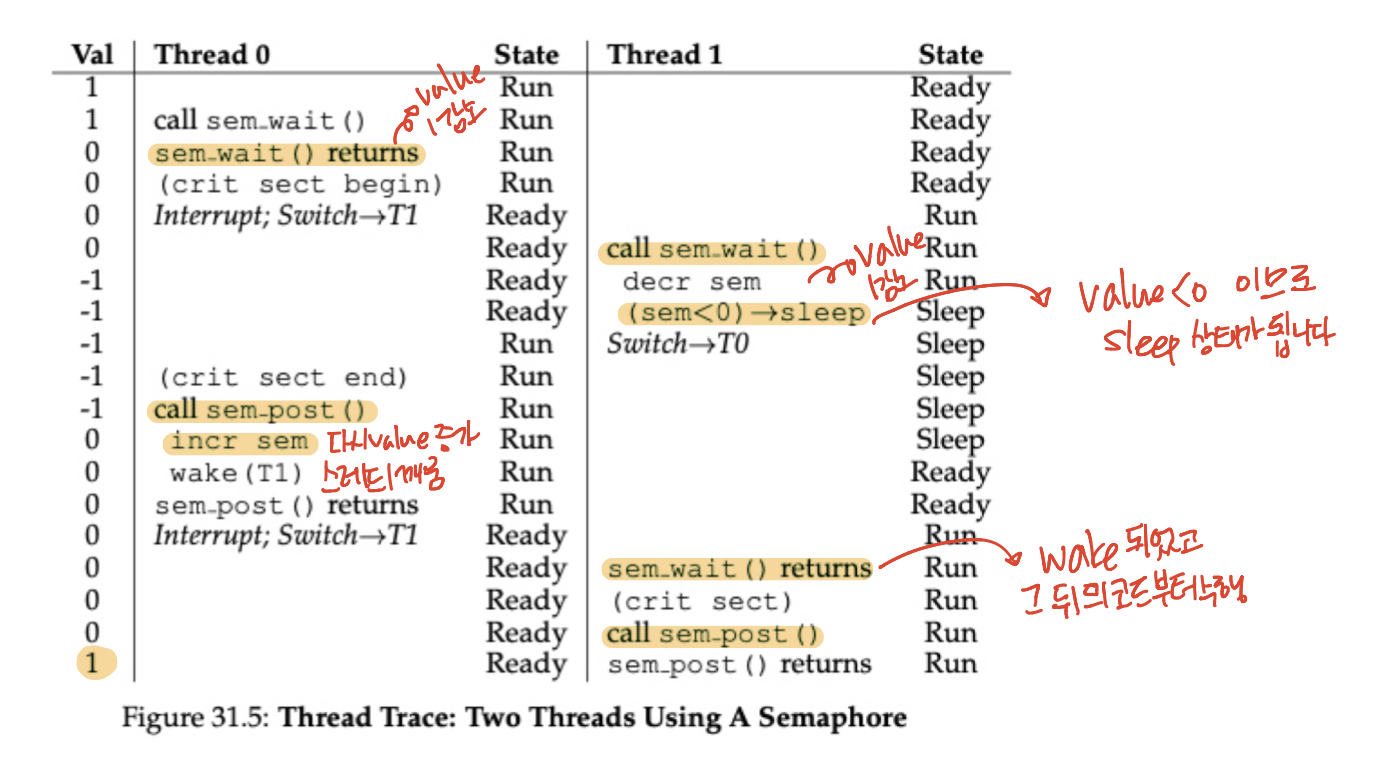 위와 같이 스레드 0이 sem_wait()를 수행한 뒤 바로 스레드 1이 sem_wait()를 수행하면 세마포어의 값은 2번 줄게 되어 -1이 됩니다. 따라서 스레드1의 sem_wait()는 세마포어의 값이 0보다 작기 때문에 스레드1의 현재 상태를 저장하고 sleep 상태로 전환하게 됩니다. 그러다 스레드0이 임계 영역에서의 작업을 끝내고 sem_post()를 수행하면 세마포어의 값을 1 늘리고 sleep 중인 스레드1을 깨웁니다. 그런 뒤 context switch가 되어 스레드1이 실행되면 아까 중단된 시점부터 시작하게 되고 임계영역으로 접근하게 됩니다. 임계영역에서의 작업이 끝나면 sem_post()를 수행하게 되고 세마포어의 값은 초기값과 같은 1로 다시 돌아오게 됩니다.