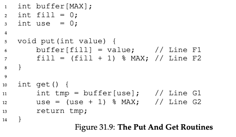 위와 같이 put(), get() 함수가 정의되어 있고 생산자와 소비자 스레드도 정의되어 있습니다. 생산자 스레드는 put()을 수행 한 뒤 sem_post()로 소비자를 깨우고 소비자 스레드는 get()을 수행 한 뒤 sem_post()로 생산자를 깨웁니다. 만약 empty 세마포어의 초기값을 1로 정한다면 어떻게 될까요?(MAX = 1로 만든다는 것)