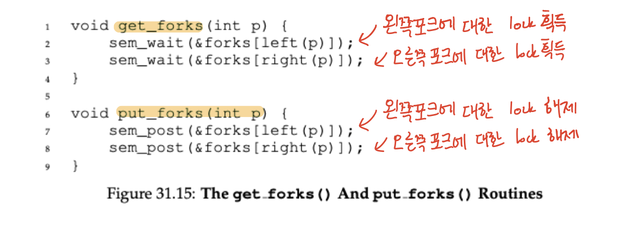아주 단순하게 마지막 철학자 보고 왼쪽을 먼저 잡지 말고 오른쪽을 먼저 잡으라고 하면 이 문제는 해결됩니다.