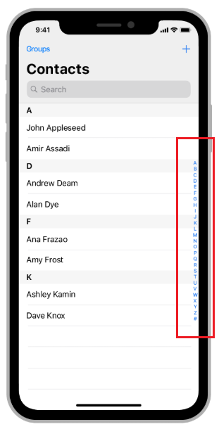 예를 들어 위의 Contacts 앱에서 각각의 contact가 하나의 열로 되어있는 것을 볼 수 있다. 또한 오른쪽의 Settings 앱에서는 그룹 별로 열들이 나누어져 있는 것을 볼 수 있다. 위와 같이 열들을 그룹으로 나누어 볼 수도 있고 하나의 그룹으로 처리할 수도 있다. 그룹을 나눌 때엔 section 별로 나눌 수 있다.