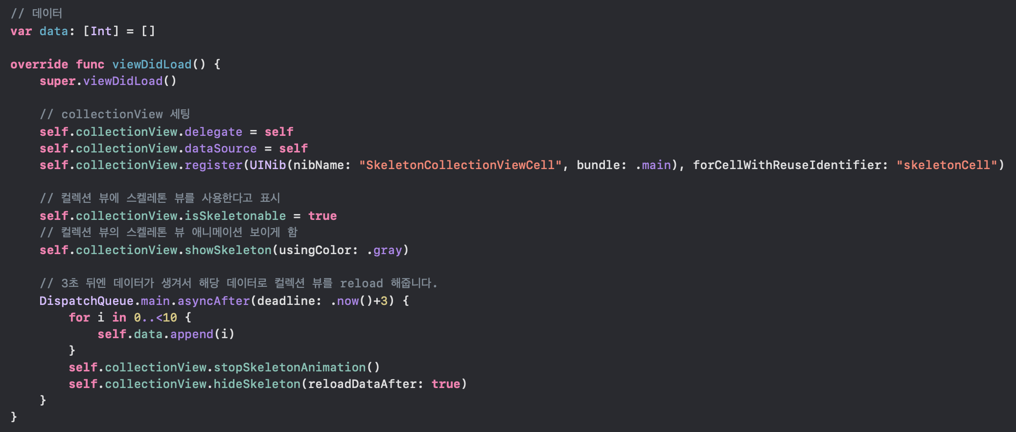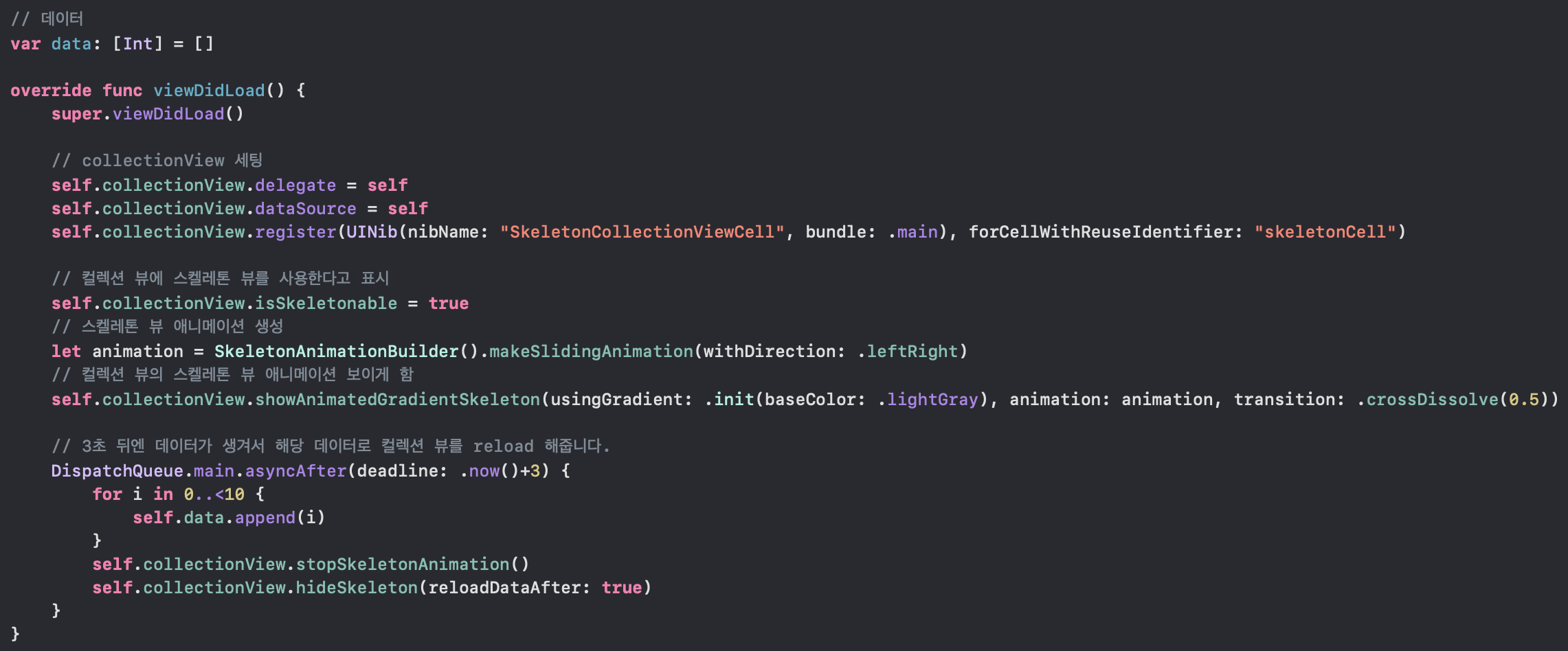 위와 같이 만들면 컬렉션 뷰는 스켈레톤 뷰 애니메이션을 3초 동안 보여주다가 3초 후엔 채워진 data 배열로 컬렉션 뷰를 구성하게 됩니다. 원래는 reloadData()라는 메서드를 써줘야 하는데 hideSkeleton() 메서드에서 매개변수를 true로 주게 되면 이를 처리해줍니다.