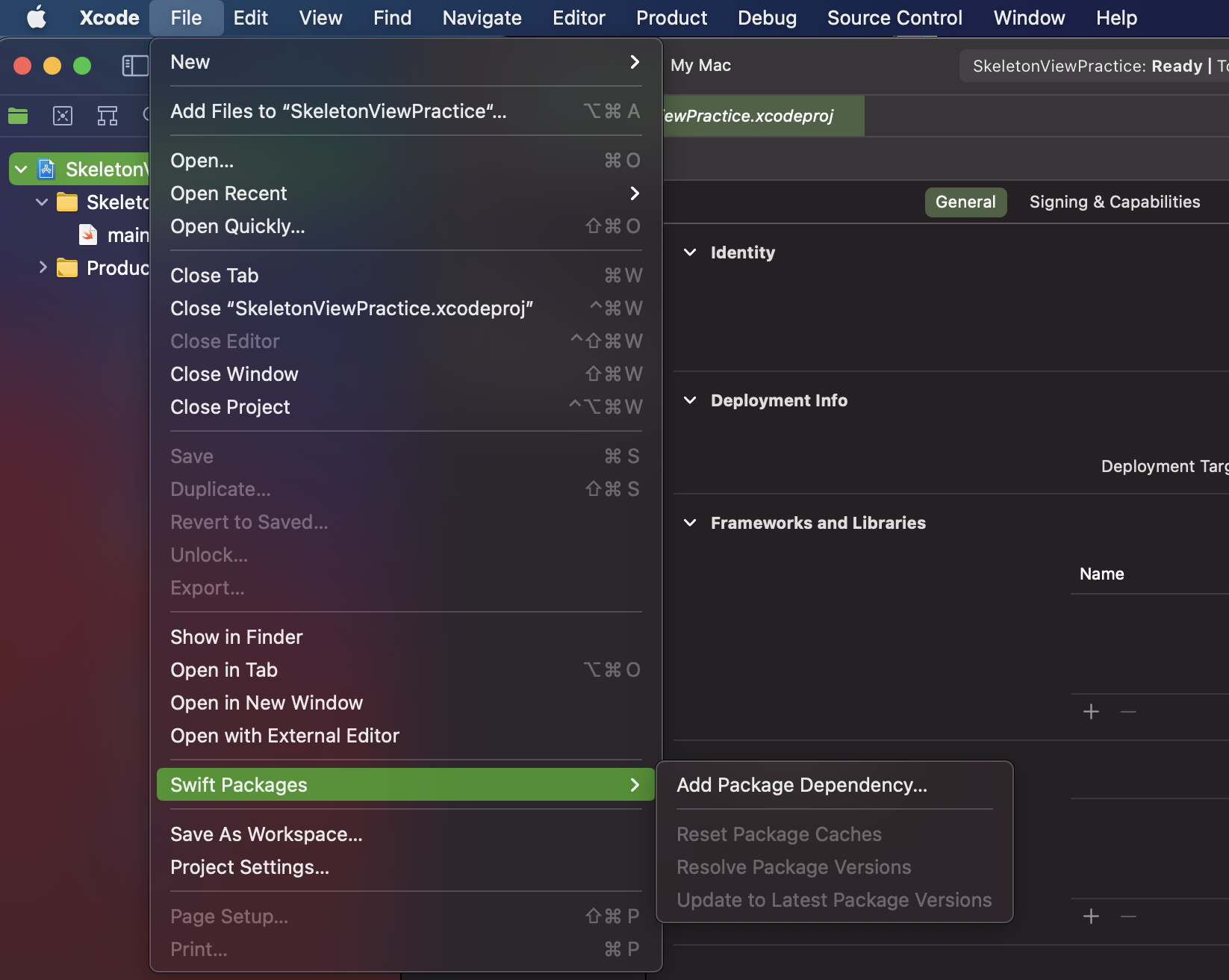 Xcode 프로젝트를 하나 만들고 아래 부분으로 가서 Add Package Dependency를 누릅니다.