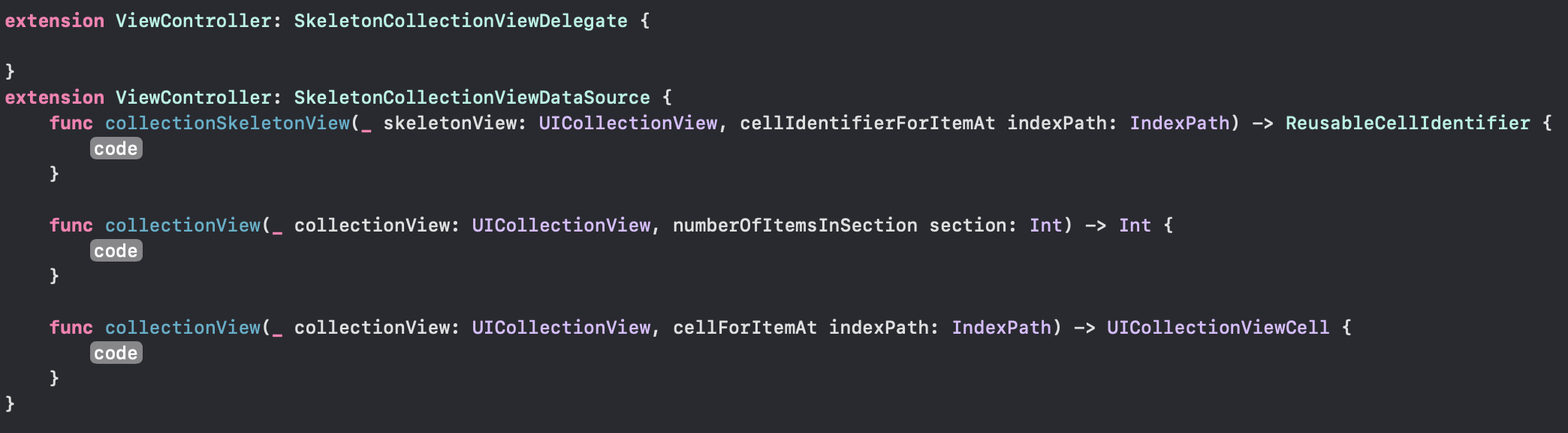 컬렉션 뷰를 사용할 때 UICollectionViewDataSource, UICollectionViewDelegate 프로토콜들을 채택해야 하는데 스켈레톤 컬렉션 뷰도 이와 비슷한 프로토콜들을 채택해야 합니다.