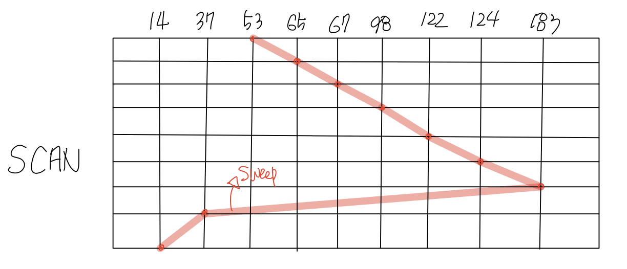 위와 같이 한 방향으로만 가다가 어느 순간 디스크를 가로지르는 부분이 생기는데 이러한 부분을 sweep이라고 합니다. 이러한 SCAN은 여러 가지 변형 방법이 존재하는데 F-SCAN이라는 방법은 sweep 중 들어오는 요청을 나중에 처리하는 방법으로 이를 사용하면 기아 상태를 피할 수 있습니다.