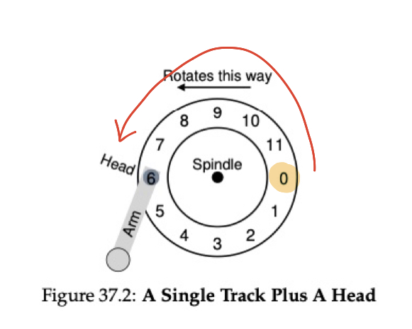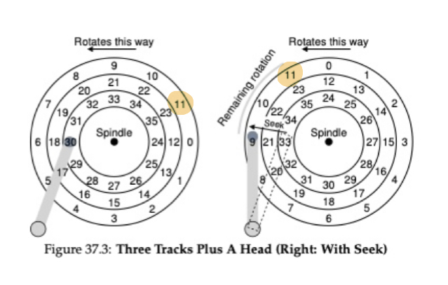 그런데 헤드의 위치가 이동할 때 surface도 함께 돌아야 효율적이지 않을까요? 위의 그림에서도 이를 볼 수 있는데요, 헤드가 가장 안쪽에서 바깥쪽 트랙으로 이동하는 동안 surface도 함께 돌아가는 것을 볼 수 있습니다. 만약 11번 섹터를 읽고 싶었다면 헤드가 아까처럼 기다려야 하겠죠. 11번 섹터가 헤드 아래 위치할 때가 I/O의 최종단계입니다. 이때부터 헤드는 데이터를 읽거나 쓰기 시작합니다. 즉 seek 한 뒤 rotational delay를 기다리고 데이터를 전송하는 과정이 디스크의 작동과정이라고 볼 수 있습니다.