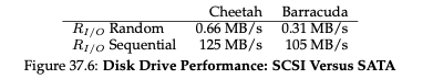 대략적으로 30 마이크로 초가 나오게 됩니다. 1ms = 1000 마이크로 초이므로 대략적으로 계산하면 Cheetah에서는 4KB의 데이터를 읽는데 6ms가 필요하네요. 여기서 I/O 속도 계산을 위해 전송 크기를 평균 시간으로 나누면 0.66MB/s라는 값이 나오게 됩니다. 동일한 계산을 Barracuda에 하게 되면 0.31MB/s라는 값이 나오게 됩니다. Sequential Workload 계산도 진행하여 정리해보면 아래와 같은 결과가 나오게 됩니다.