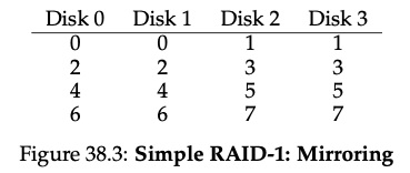 따라서 아직은 디스크 손상과 같은 아무도 모르게 발생하는 오류에 대해 걱정할 필요는 없습니다. 또한 latent sector error(잠재 섹터 오류)라고 하는 다른 작업 디스크에서 단일 블록에 접근할 수 없는 문제도 아직은 걱정할 필요가 없습니다. 물론 나중에는 이러한 복잡한 오류들을 알아봐야겠죠?