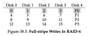 연속 쓰기의 경우 striping 방법으로 블록들을 저장하기 때문에 빠르게 진행할 수 있는데요, 예를 들어 위와 같은 디스크를 가진 RAID 4에 블록 0,1,2,3에 쓰기 요청이 발생했다고 생각해보겠습니다. RAID는 0,1,2,3과 패리티 블록 P0에 쓰기 작업을 할 수 있습니다. 이에 대한 성능은 패리티 블록을 제외한 만큼의 성능이 나오게 됩니다. 또한 위와 같이 striping으로 쓰기 작업을 수행하는 것이 RAID 4의 가장 효율적인 쓰기 방법입니다.