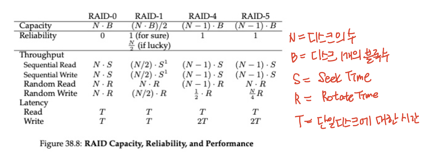 RAID 성능을 분석할 때 두 가지 다른 기준으로 분석할 수 있는데요, 하나는 single request latency(단일 요청 대기 시간)입니다. RAID에 하나의 I/O 요청에 걸리는 시간을 알아내면 하나의 논리 I/O 작업 중에 얼마나 많은 병렬 처리가 존재하는지 알 수 있습니다. 두 번째 기준은 RAID의 처리량, 즉 쉽게 말해 대역폭입니다.