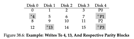 위와 같이 블록 4, 블록 13에 대하여 쓰기 요청이 발생했다고 생각해보겠습니다. 이렇게 진행되면 접근해야 하는 디스크는 디스크 0,1,4가 되겠죠? 디스크 0, 1에 대한 작업은 병렬로 처리할 수 있는데 parity 블록이 저장되는 디스크 4에서는 병목 현상이 발생할 수 있습니다. 이러한 문제를 RAID 4에서 발생하는 small write 문제라고 합니다. 따라서 RAID 4를 사용하면 항상 parity 디스크가 병렬 처리를 하지 않고 직렬 처리를 하도록 만듭니다. 때문에 쓰기 작업이 작다면 RAID 4의 처리량이 나빠지는 것이죠. 이러한 문제를 해결한 방법이 지금부터 알아볼 RAID 5입니다.