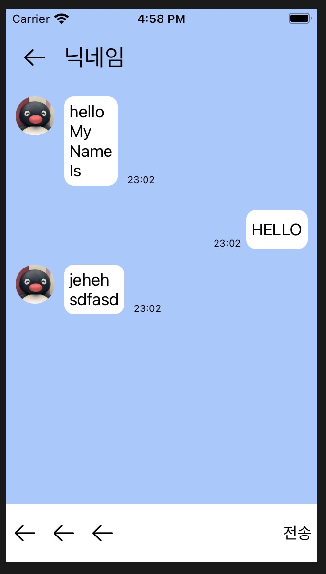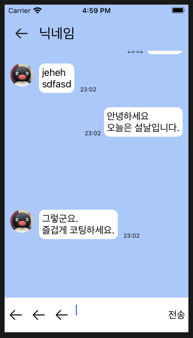 UI 작업에 있어 어려웠던 부분은 채팅방을 UICollectionView로 만들었는데, 메시지의 길이에 따라 셀의 높이를 동적으로 변화해줘야하는 부분이 어려웠던 것 같다.
