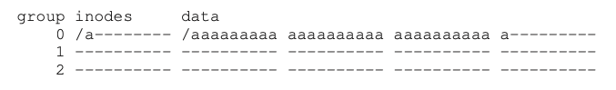 위와 같이 a라는 파일이 너무 커서 그룹의 블록들을 거의 다 사용해 버릴 수 있다는 얘기가 됩니다. 이렇게 된다면 만약 a파일이 있는 디렉터리에 다른 파일들이 있을 때 다른 파일들은 동일한 그룹에 존재하지 못할 수 있게 됩니다. 이러한 문제를 해결하기 위해 FFS는 a 파일과 같은 대용량 파일은 몇 개의 그룹에 chunk 단위로 분산하여 배치합니다. Chunk 단위란 하나의 그룹에 저장할 블록 개수라고 보면 됩니다. 그럼 아까의 구조 말고 chunk를 블록 5개로 정해서 디스크에 배치해보겠습니다.