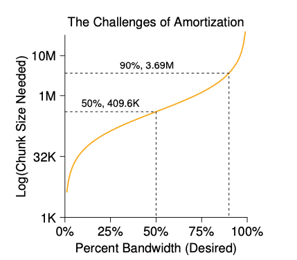 위와 같이 a 파일을 여러 개의 그룹에 배치하는 것이죠. 이렇게 하면 하나의 그룹에 대한 사용률도 분산할 수 있습니다. 근데 이렇게 배치해버리면 a라는 파일을 연속적으로 읽을 수 없기 때문에 성능이 저하된다고 생각되는데요, 이러한 문제는 chunk 크기를 주의 깊게 정하면 해결할 수 있습니다. chunk 크기가 충분히 크다면 거의 대부분의 시간을 데이터를 전송하는데 쓸 수 있고 전체 시간에서 다음 chunk로 이동하는 시간의 비율을 낮게 유지할 수 있습니다. 이러한 것을 amortization(상각)이라고 합니다. 예를 보며 정말 그런지 볼까요?