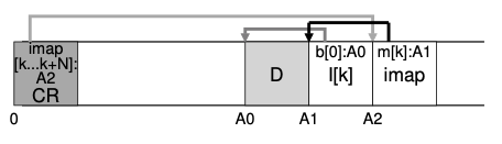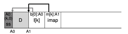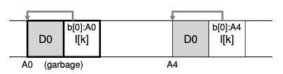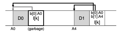위의 그림은 파일 k가 있고 이 파일의 블록 중 유효한 블록을 찾는 그림입니다. 헤더 블록에 A0: (k,0)이라는 정보가 보이시나요? 이 정보가 inode, offset 정보인데요, 이를 통해 k 파일의 유효한 블록을 찾을 수 있습니다.