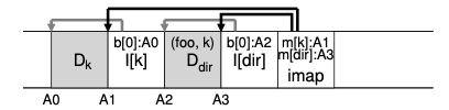 위의 그림은 디렉터리에 foo라는 파일을 만들었을 때 디스크 구조입니다. inode map은 디렉토리(dir)와 foo라는 파일의 inode 주소를 가지고 있습니다. 그리고 디렉토리 inode에는 자신에게 속한 파일인 foo의 inode를 가지고 있습니다. 그리고 그 inode로 foo의 데이터 블록인 A0에 접근할 수 있게 됩니다.