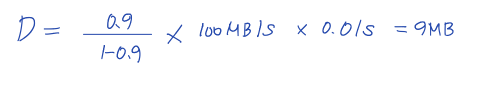 위와 같이 계산을 해서 Tp = 10ms, 대역폭이 100MB/s인 디스크에 90%의 대역폭을 사용할 때에 D를 구해보면 아래와 같습니다.