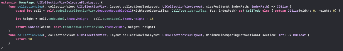 처음에는 위와 같이 현재 indexPath의 Cell을 불러와서 해당 Cell의 Label의 높이를 더해서 적용하려고 했습니다. 하지만 Cell의 Size는 UICollectionViewDataSource에서 Cell을 구성하기 전에 설정되어 위와 같은 방식에서는 실제 데이터에 맞는 높이를 설정할 수 없었습니다. ViewDidAppear에서 reloadData()를 사용하여 이를 수정할 수 있었지만 화면이 나온 뒤에 수정되는 것이 보기 싫었습니다.