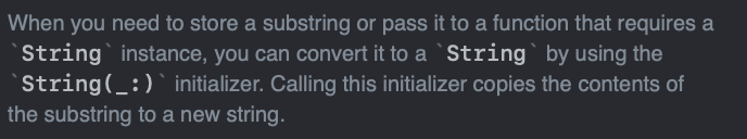 위와 같은 주석을 찾을 수 있었는데요, Substring을 String으로 사용하려면 String(_:) 생성자로 새로운 String을 생성하여 사용해야 한다! 라고 적혀있습니다.