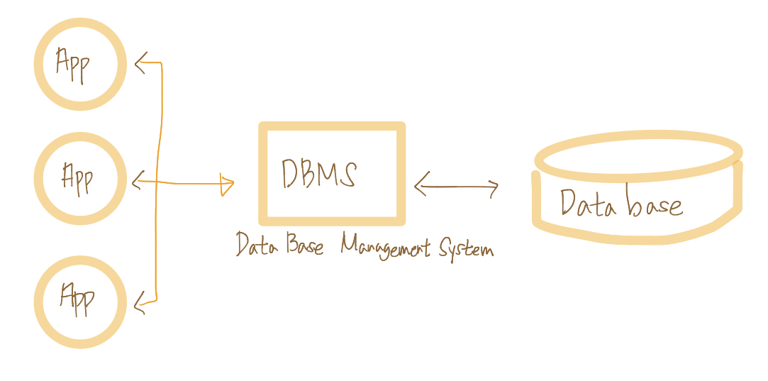 아까 본 그림을 다시 가져와서 보면 프로그램과 데이터 베이스 사이에 DBMS라는 것이 존재하는 것을 볼 수 있는데요, DBMS를 포함하여 몇 가지 용어들을 짚고 넘어가 보겠습니다.