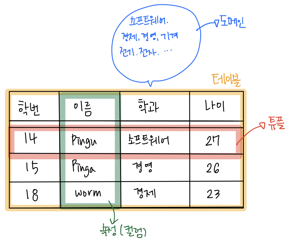 - 관계형 DB에서 정보를 구분하여 저장하는 기본 단위