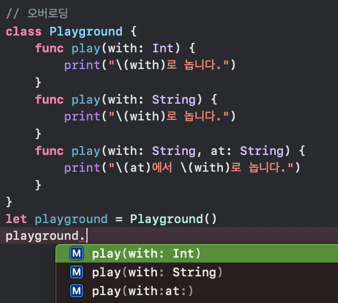 self.play(with: "Swift", at: "Mac") // self 키워드로 동일한 객체의 다른 메서드에 접근!