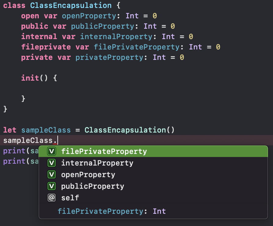 fileprivate의 이름을 보면 어떻게 접근을 제한할지 알 수 있는데요, 말 그대로 동일한 소스 파일에서만 접근이 가능하다는 말입니다. 즉 쉽게 말하면 해당 클래스가 정의된 소스 코드에서는 fileprivate로 선언된 프로퍼티에 접근할 수 있다는 말이 됩니다.