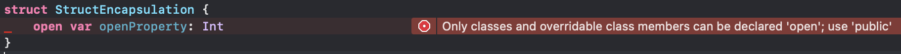 위와 같이 Struct, Enum에 open 접근 제한자를 사용하려고 하면 오류를 발생시킵니다.