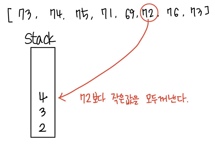 - 배열이 비었거나 배열의 마지막 값이 현재 값보다 크다면 현재 인덱스를 스택에 넣습니다.