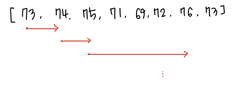 주어진 배열의 값보다 큰 값이 얼마나 멀리 떨어져 있는지를 찾는 것이 이 문제의 목표인데요, 일단 O(n^2) 방법으로 하나씩 모두 보는 방법이 있습니다.