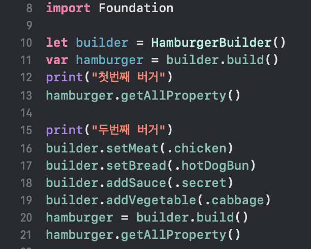 또한 builder의 값들을 적절히 설정해서 다양한 유형의 햄버거 객체를 만들 수 있는 것을 볼 수 있어요.