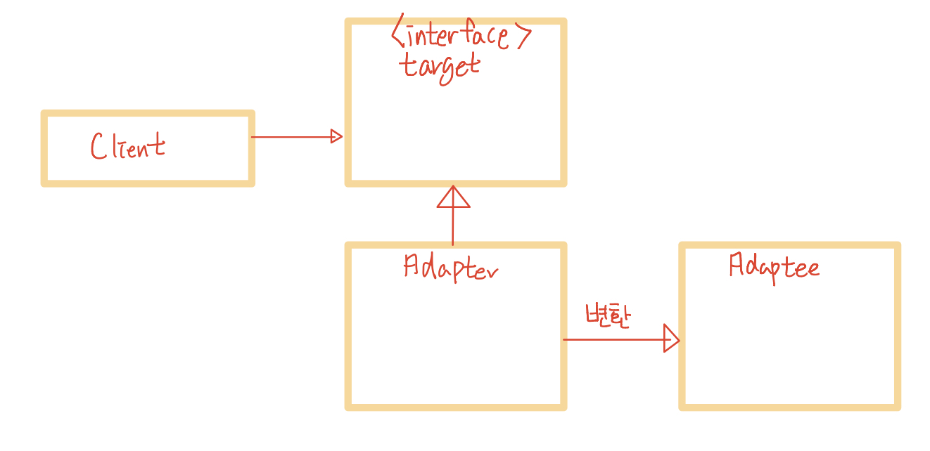- Adaptee는 현재 존재하는 클래스가 아닌 외부에서 가지고온 유용한 클래스입니다. 따라서 인터페이스가 다르기 때문에 바로 사용할 수가 없습니다.