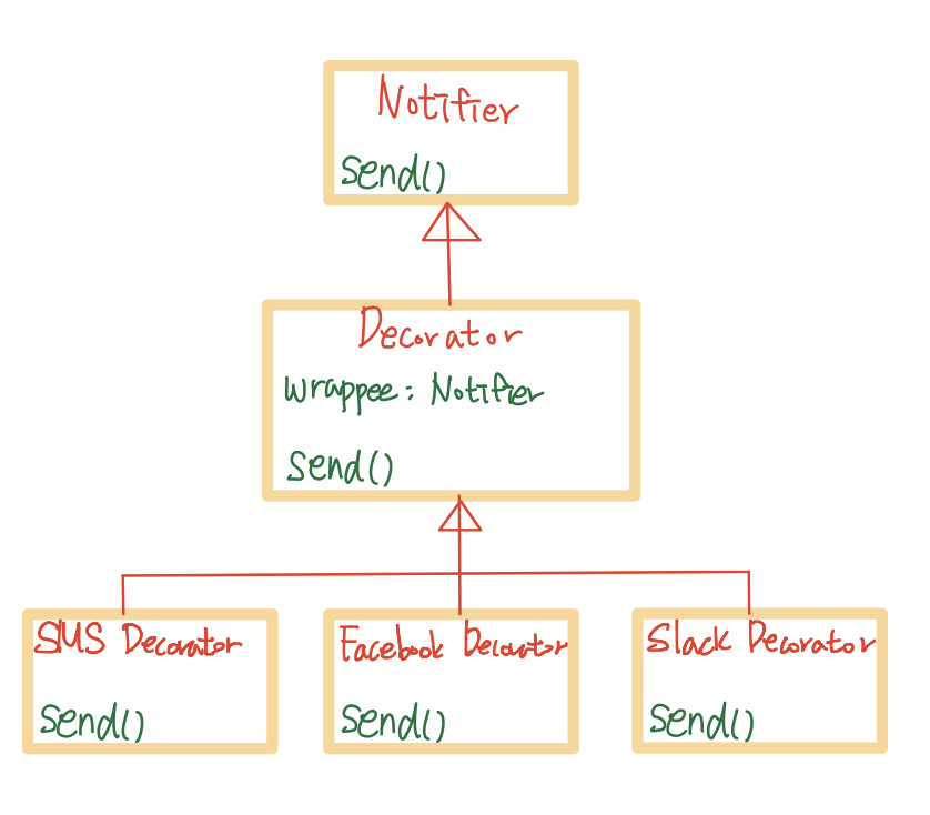 그런데 또 시간이 지나 사용자 중 다양한 플랫폼에서 한 번에 알람을 받기를 원하는 사용자가 발생했습니다. SMS, Facebook, Slack 플랫폼 모두에서 말이에요. 이를 위해 또 알람을 줄 플랫폼의 조합에 따라 상속을 받아 처리하는 것은 너무 비효율적입니다. 이럴 때 데코레이터 패턴을 사용하면 됩니다!