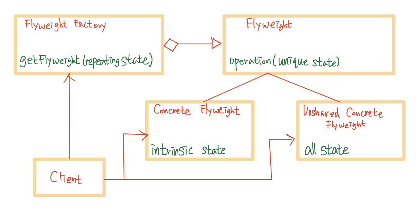 이러한 Flyweight 객체를 쉽게 만들기 위해 팩토리 메서드 패턴을 사용합니다. 찾고자 하는 Flyweight 객체를 찾고 있다면 이를 반환해주고 없다면 새로 만들어서 반환해주면 됩니다.