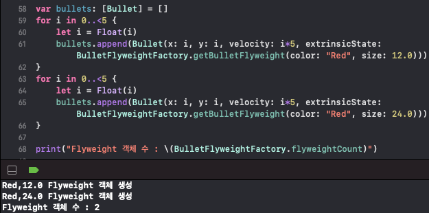 print("Flyweight : \(x),\(y),\(velocity) 값을 갖는 \(extrinsicState.color), \(extrinsicState.size) 총알")