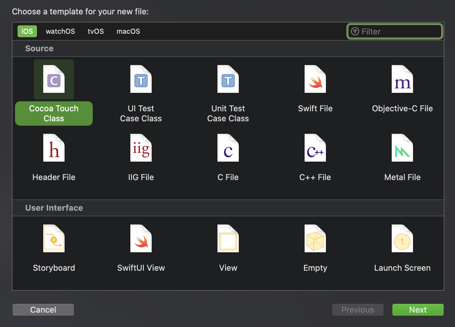 우선 그전에 뷰 컨트롤러의 역할을 해줄 새로운 ViewController를 하나 추가해줘야합니다. command + N 단축키를 사용하여 MyViewController.swift파일을 새로 생성합니다.