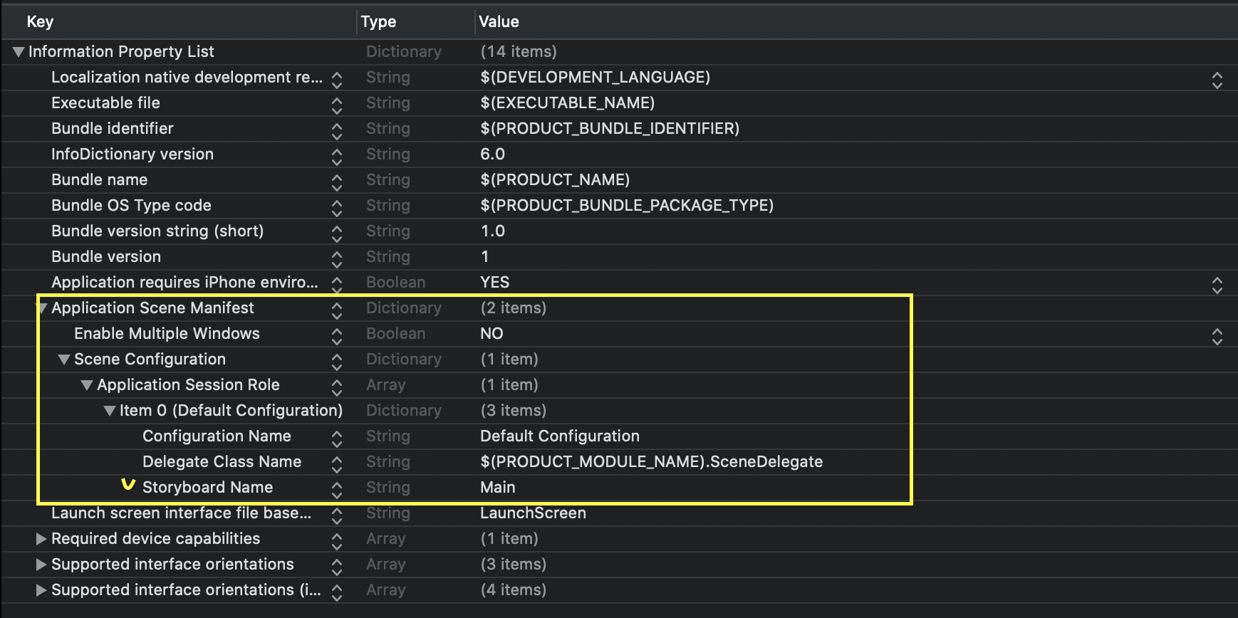 그리고 아까 처음 생성된 파일 중 Info.plist 파일로 가서 위와 같이 체크된 부분을 삭제해줍니다.