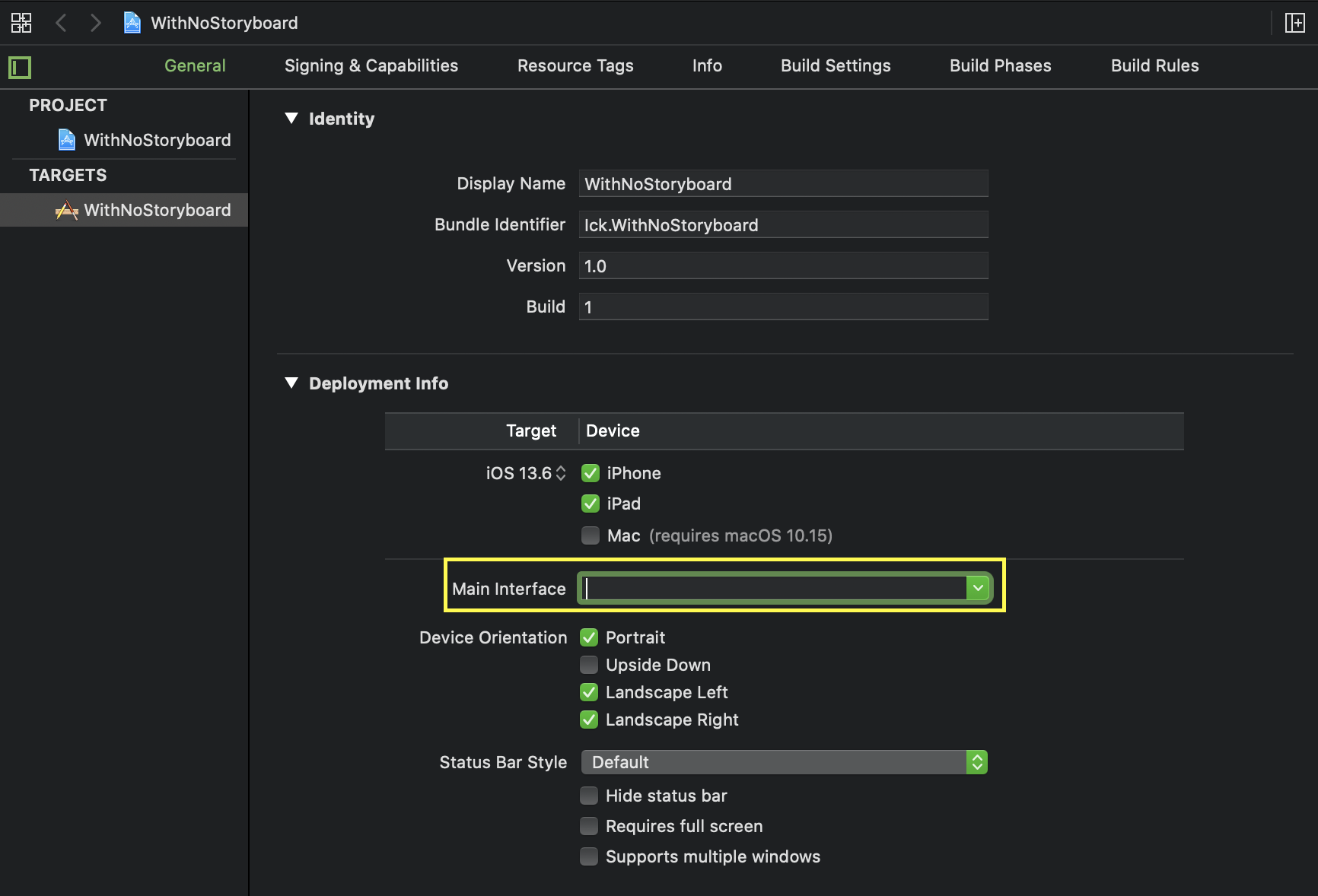 위의 사진과 같이 프로젝트의 설정 부분에 Main Interface부분에 처음엔 Main이 적혀있을 텐데 이를 그냥 빈칸으로 비워둡니다.