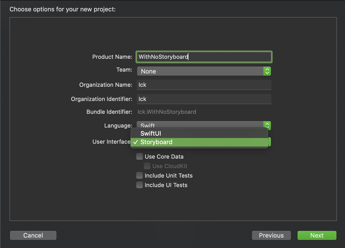 그다음 User Interface에서 Storyboard를 선택하고 프로젝트를 생성합니다.