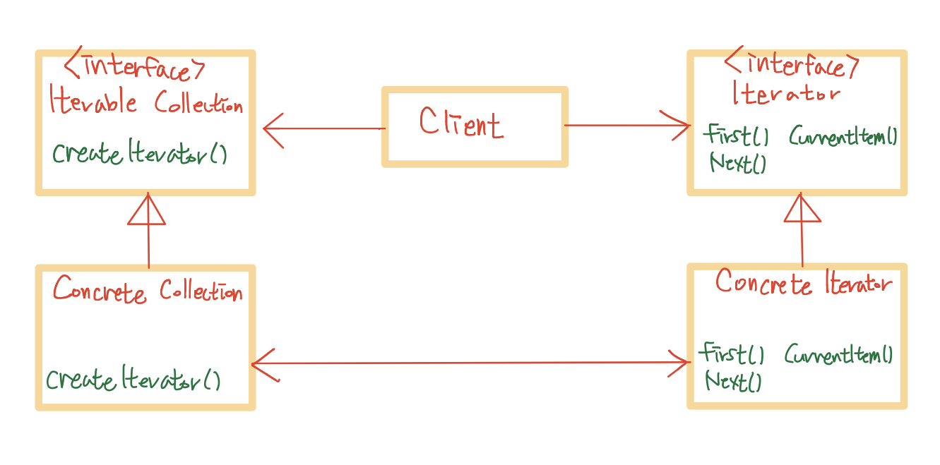 이러한 Iterator는 Collection의 요소를 가지고오는 하나의 방법을 제공하는데요, 클라이언트는 아무것도 반환하지 않을 때까지 반복문을 통해 요소를 가지고 오게 됩니다. 또한 특정 Collection을 탐색하는 특별한 방법이 필요한 경우 Collection, Client를 수정하지 않고 새로운 Iterator 클래스만 만들어주면 됩니다.
