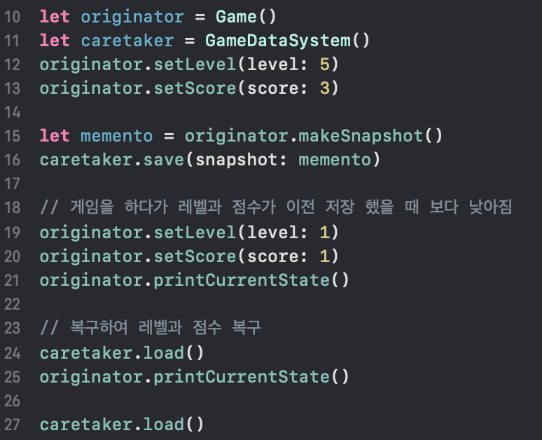 그럼 Memento Pattern을 Swift 언어로 간단하게 구현해보도록 하겠습니다.
